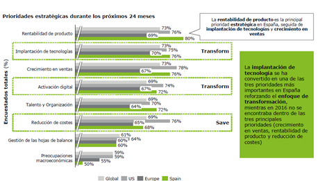 Según muestra la última encuesta de Deloitte sobre gestión de costes "Save to transform: gestión de costes en entornos de disrupción tecnológica y desaceleración económica" realizada a más de 1.200 ejecutivos de las principales regiones e industrias globales, las 3 prioridades para los 2 próximos años son la transformación tecnológica, la transformación digital y la optimización de costes.