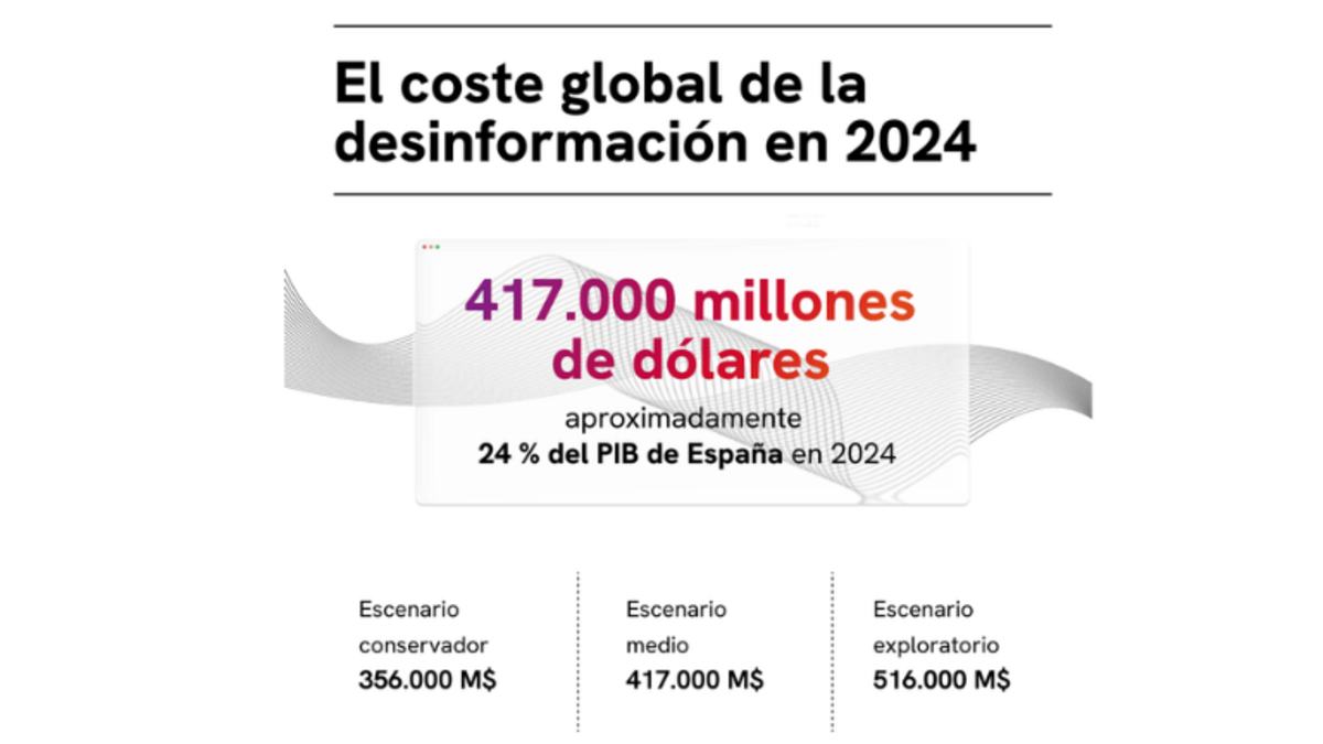 Impacto financiero: entre 353.500 y 456.400 millones de dólares, impulsado por fenómenos como reseñas falsas, manipulación de mercados, fraudes basados en IA (incluidos deepfakes) y la economía publicitaria asociada a sitios de desinformación.