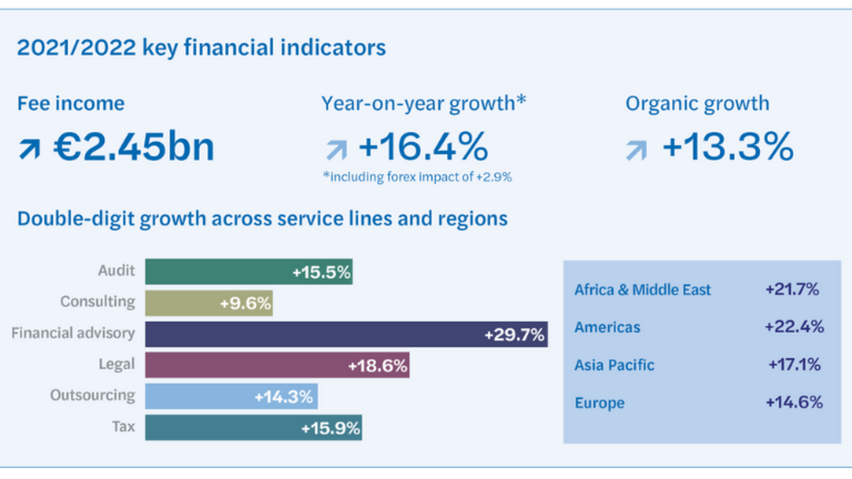 Mazars, la firma internacional de auditoría, consultoría y asesoramiento fiscal, legal ha publicado hoy sus resultados globales que registran un crecimiento del 16,4%, alcanzando los 2.450 millones de euros de facturación en el ejercicio 2021/2022 (cerrado a 31 de agosto de 2022). La Firma ha registrado un fuerte incremento de su actividad en todas las regiones y servicios, tanto en auditoría como en servicios de asesoramiento.