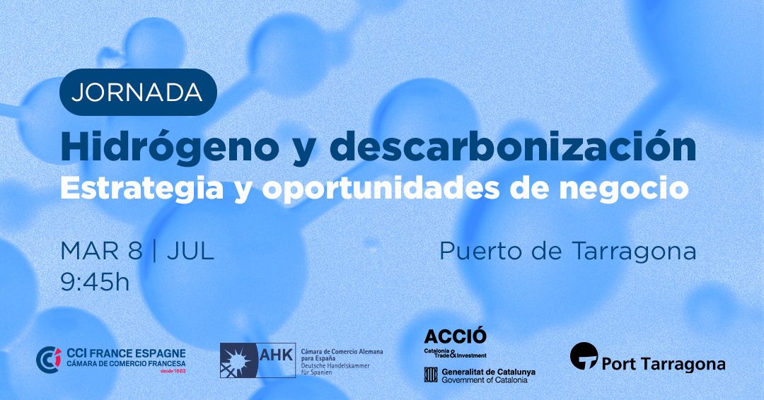 La Cámara de Comercio Francesa de Barcelona, en colaboración con la Cámara de Comercio Alemana para España, Port de Tarragona y ACCIÓ, te invitan a participar en una jornada estratégica dedicada a la descarbonización y al desarrollo del hidrógeno en Catalunya.